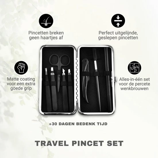 Deze luxe 7 delige epileer set bestaat uit een gebogen schaartje, meerdere pincetten, wenkbrauw shaper, wenkbrauw borstel en een scheermes. De verschillende pincetten geven je de mogelijkheid extra precies te werken. Super handig omdat dat alles is wat je nodig hebt bij het epileren (het verwijderen van haartjes) en het model geven aan je wenkbrauwen. Daarnaast komt deze set in een luxe bewaartas om de set goed en veilig op te bergen.