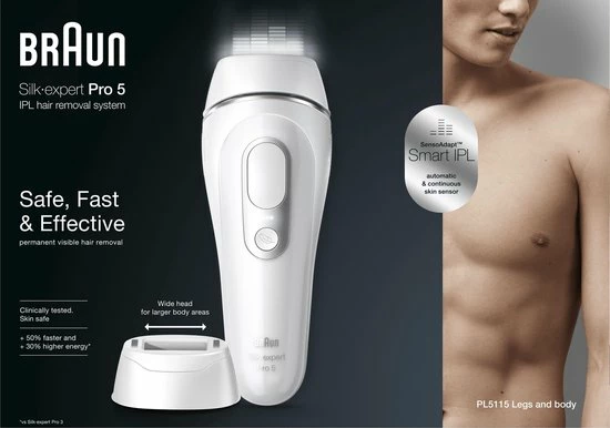 De Silk?expert Pro 5 is de beste IPL van Braun voor ontharing thuis. Dit IPL-ontharingssysteem voor mannen is klinisch erkend door de Skin Health Alliance. 2x zo snel als de vorige Silk?expert 5: beide benen in minder dan 5 minuten behandeld, vanuit het comfort van uw huis. De SensoAdapt-sensor past zich automatisch aan de huidtint aan voor een optimale balans tussen doeltreffendheid en veiligheid. 3 instellingen voor zachtheid verzekeren het huidcomfort. 400.000 flitsen garanderen zichtbare en blijvende ontharing. Niet geschikt voor gebruik op baard.