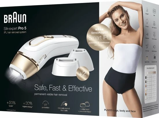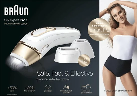 De Silk?expert Pro 5 is de beste IPL van Braun voor ontharing thuis. Dit IPL-ontharingssysteem voor vrouwen en mannen is klinisch erkend als veilig voor de huid door de Skin Health Alliance. Dubbel zo snel als de vorige Silk?expert 5: beide benen kunnen in minder dan 5 minuten worden behandeld, vanuit het comfort van uw huis. De SensoAdapt-sensor past zich automatisch aan uw huidtint aan voor een optimale balans tussen doeltreffendheid en veiligheid. 3 instellingen voor zachtheid verzekeren het comfort van uw huid. 400.000 flitsen garanderen zichtbare en blijvende ontharing.