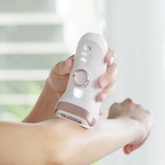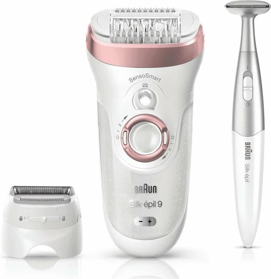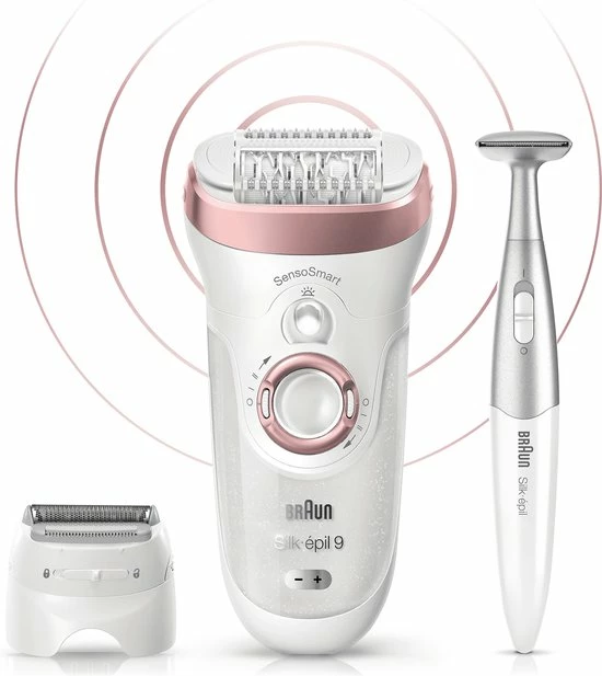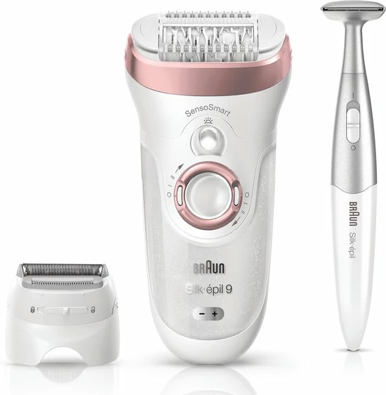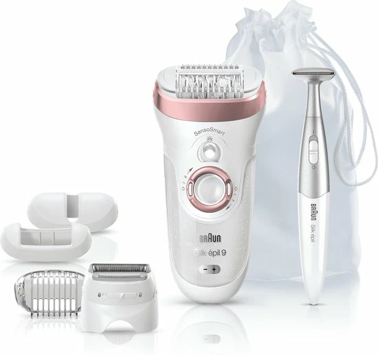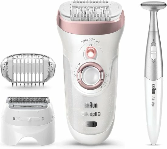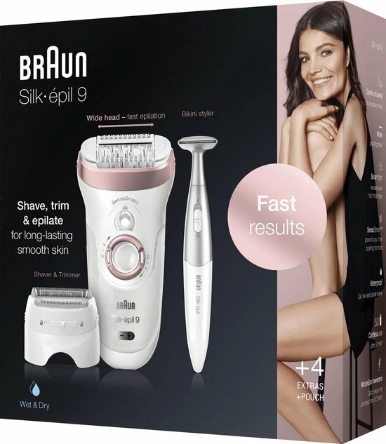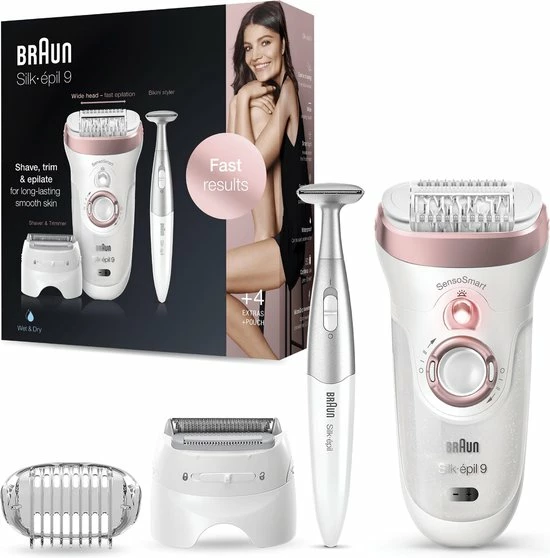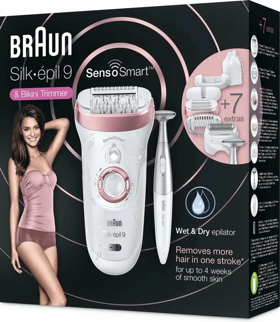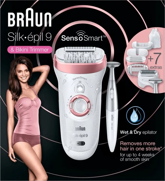 Silk-?pil 9, met een brede kop voor een snellere epilatie en ultrasnelle resultaten. Hij heeft extra opzetstukken voor het scheren, trimmen en epileren voor een huid die weken glad blijft, en niet slechts enkele dagen.