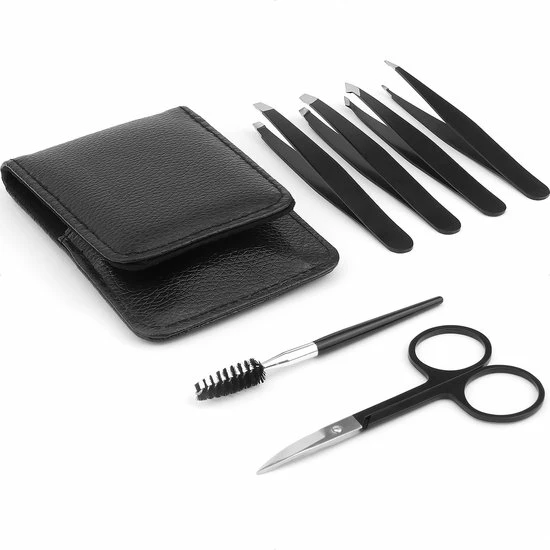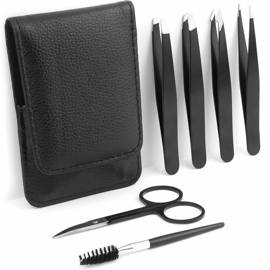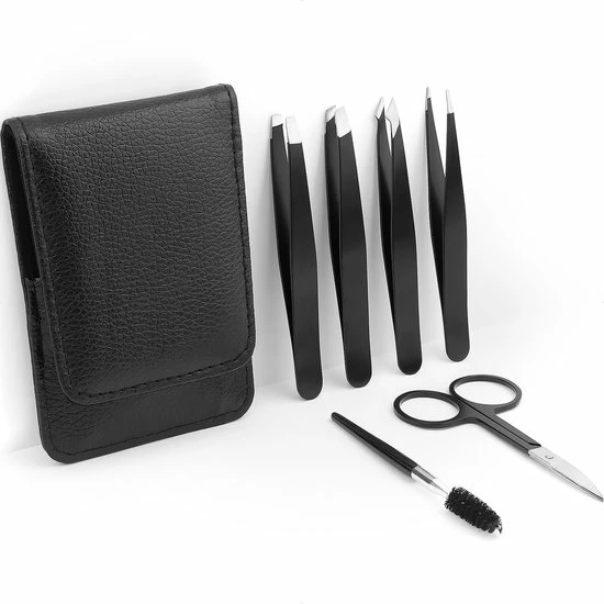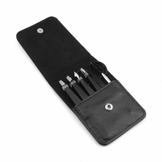 De wenkbrauw trimmer set wordt geleverd in een handig zwart kunstlederen etui. Zo is zijn alle onderdelen veilig opgeborgen en houd je de set bij elkaar. Voor extra veiligheid is elk pincet voorzien van een siliconen beschermhoesje of bandje.