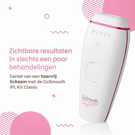 Het GoSmooth IPL Ontharingsapparaat Classic helpt bij het veilig en pijnloos ontharen van de huid en is geschikt voor alle lichaamsdelen. Het apparaat bevat 5 verschillende standen en wel 400.000 flitsen, wat genoeg is voor 8 jaar gebruik. Met behulp van het UV-Filter, de huidsensor en automatische flitsstand is het IPL ontharingsapparaat eenvoudig en veilig thuis te gebruiken. Gebruik v??raf de IPL behandeling het scheermes, tijdens de behandeling de beschermende zonnebril en verzorg de huid achteraf met de GoSmooth Alo? Vera Gel.
