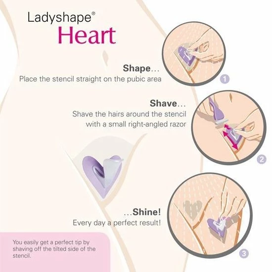 De Ladyshape Heart is uniek en full of fun. Met behulp van deze handige bikini shaping tool scheer je gemakkelijk en snel een perfect hartje in je schaamhaar. Door heel eenvoudig de haartjes rond de bikini shaping tool weg te scheren, wordt je schaamstreek nog mooier en verzorgder. Voor een aantrekkelijk en zelfverzekerd gevoel. Keer op keer.