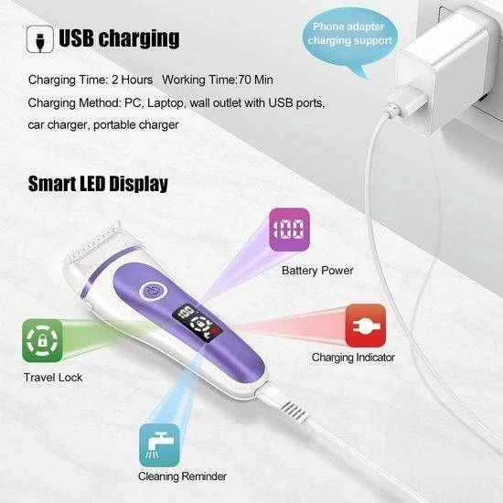 Droog en nat scheren met dit scheermes dat onder water kan worden gereinigd. – Scheermes voor vrouwen. Met de waterdichte technologie ipx6 scheer je veilig met schuim onder de douche of in bad of scheer je direct droog. In ieder geval krijg je een intense scheerervaring en een zijdezachte huid. Het schoonmaken van de bikinitrimmer is eenvoudig en comfortabel.