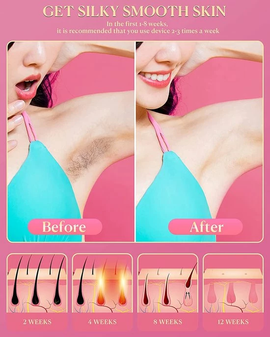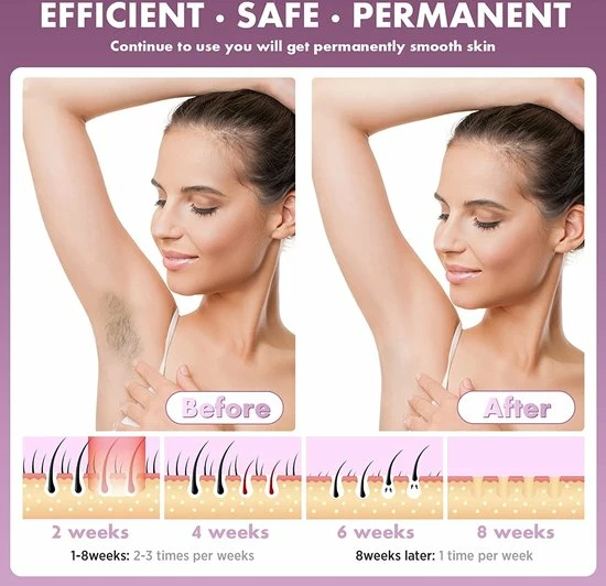 - 【Afscheid van herhaalde haarverwijdering】- Na duizenden studies is het gebleken dat het met onze fotonen-ontharingsapparaat met vriespunt slechts enkele weken duurt, tot een gladde, zachte en gevoelige huid ontstaat. Meer dan 8-12 weken heeft 95% van de gebruikers geen haargroei meer. Neem altijd afscheid van haarproblemen.
