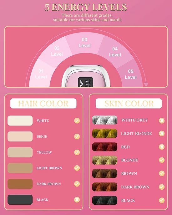 - 【5 instelbare energieniveaus】- Het gezichtsscherm voor dames beschikt over vijf instelbare lichtenergie-instellingen om ervoor te zorgen dat verschillende huidtypes zacht en effectief kunnen worden behandeld. Je kunt kiezen uit vijf lichtenergieniveaus, die het meest geschikt zijn voor je huidtype en haar en genieten van een pijnloze en comfortabele ontharing. Na consequent gebruik kun je een gladde en aangename haarloosheid bereiken.