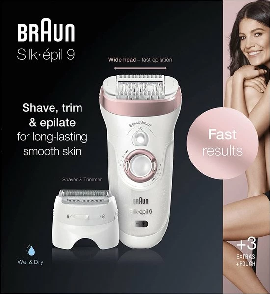 De Braun Silk-?pil 9-720 met een brede kop voor ultrasnel epileren, epilator, epileerapparaat. Geniet wekenlang van een gladde huid dankzij de Micro-Grip-technologie en een 40% bredere kop die haartjes verwijdert van 0,5 mm, epilator, epileerapparaat. De scheer- en trimmerkop geven je extra opties voor gevoelige gebieden en de epilator, epileerapparaat voor vrouwen is 100% waterbestendig, wat betekent dat je in bad of onder de douche kunt epileren voor een vrijwel pijnloze ervaring. Doos bevat: 1 x epilator 1 x scheerkop 1 x trimmerkop 1 x etui 1 x huidcontactopzetstuk 1 x reinigingsborsteltje 1 x oplader