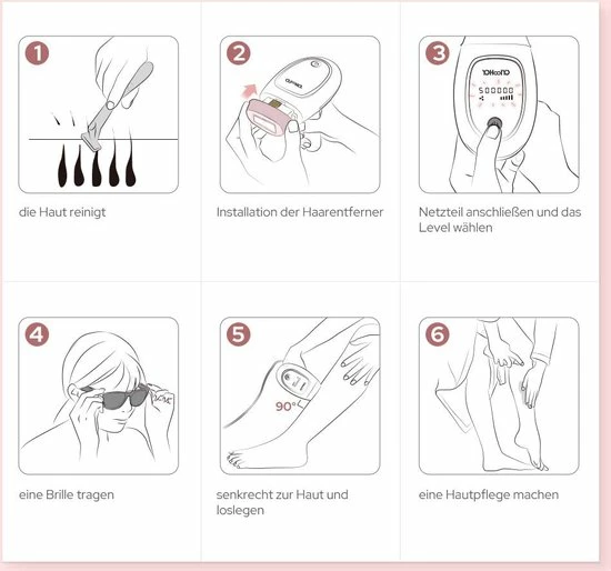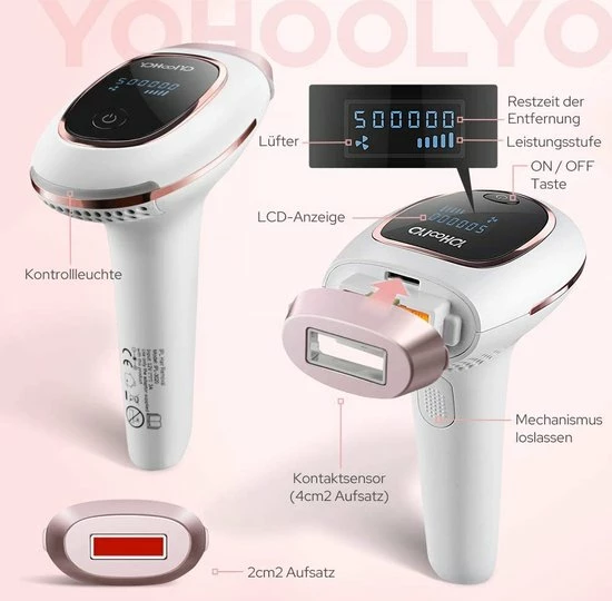YOHOOLYO heeft ook een scheerapparaat, een make-uptas en een zonnebril voor het verwijderen van de haarbehandeling en een glanzende huid op elk moment in verschillende lichaamsdelen. Voor permanente ontharing adviseren wij 6-12 toepassingen (vooral afhankelijk van het huidtype en de sterkte van de haarwortel).