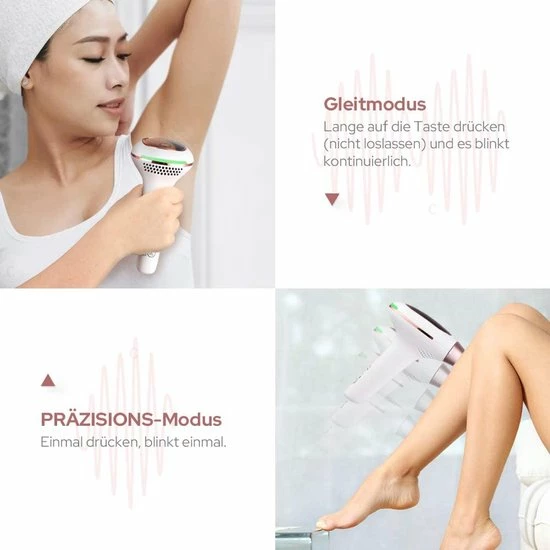 - 5 niveaus / twee-modus: 5 verschillende energieniveaus waarmee de gebruiker afhankelijk van de huidskleur en haarkleur kan kiezen, om het intense licht te garanderen. Begin voor het eerst van niveau 1 om je aan het apparaat te wennen en knippert voordat je naar een hoger niveau loopt.