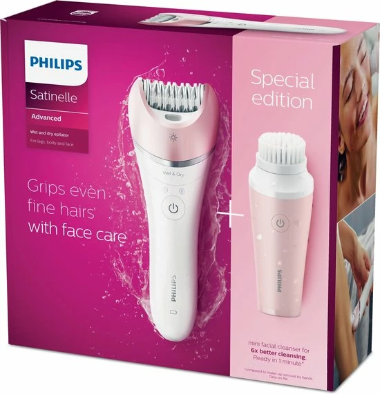 Dit speciale editie-pakket van de Philips Satinelle Advanced bestaat uit de Wet & Dry-epilator en de minigezichtsreiniger. Grijp zelfs de fijnste haartjes stevig vast. Geniet van een superzachte huid dankzij het extra brede epileerhoofd dat in ??n beweging meer huid behandelt. Door de unieke keramische schijven grijp je zelfs de fijne haartjes voor het beste resultaat. De minigezichtsreiniger zorgt daarnaast voor een diepere reiniging in slechts 1 minuut. Wanneer je de epilator volledig hebt opgeladen dan kun je deze 40 minuten gebruiken. Dankzij de Lithium-Ion batterij heeft de epilator een oplaadtijd van slechts 90 minuten.