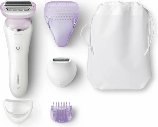 De ladyshave wordt geleverd met een trimhulpstuk voor de bikinlijn, een kam voor de bikinitrimmer, een beschermkapje, een kap voor het gladtrekken van de huid en een basisetui.