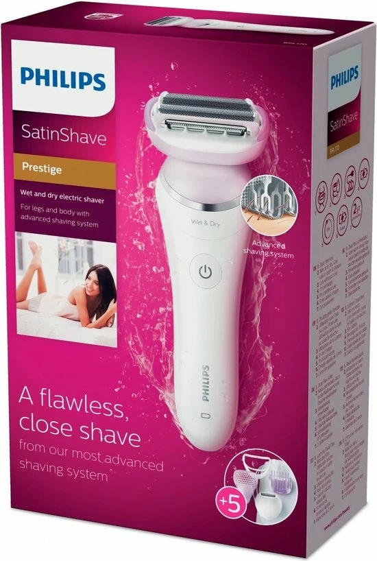 Geniet van een perfect gladde en comfortabele scheerbeurt voor uw benen en lichaam met de Philips SatinShave Prestige BRL170/00. Ons meest geavanceerde scheersysteem zorgt voor een zijdezachte huid zonder irritatie en is zowel nat als droog te gebruiken. SatinShave Prestige is zo comfortabel dat u iedere dag kunt scheren, maar scheert zo glad dat het niet hoeft. Het multiflex scheerhoofd met dubbel scheerblad zorgt ervoor dat je minder haartjes mist. Daarnaast zorgen de zachte kussentjes voor langdurig comfort en een uiterst zachte huid. De ladyshave beschikt over een snel opladen functie waarmee het scheerapparaat in 5 minuten kan worden opgeladen voor een volledige scheerbeurt. Dit product wordt geleverd met 5 accessoires.