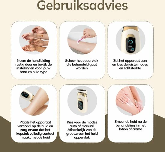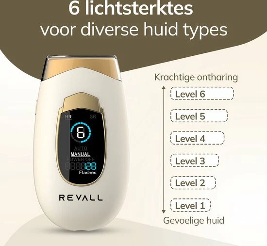 Het REVALL IPL Ontharingsapparaat beschikt over 6 lichtsterktes. Hierdoor kan voor ieder huid en haar type de meest effectieve behandeling worden gegeven. In onze handleiding staan advies, richtlijnen en stap voor stap uitgelegd hoe het ontharingsapparaat te gebruiken is. Waaronder welke lichtsterkte voor jou het beste resultaat en veiligste behandeling geeft. Een behandeling moet in iedere uitgangssituatie pijnloos zijn. Mocht er na de behandeling lichte irritatie ontstaan, bekijk dan onze handleiding voor advies en verlaag de lichtsterkte.
