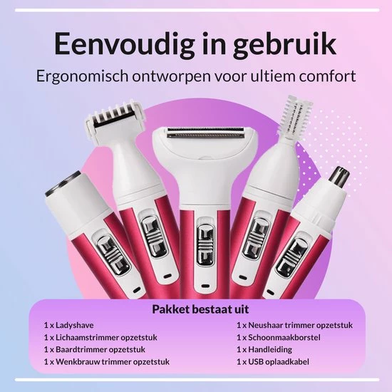 - Multifunctioneel? Met onze ladyshave voorzien van 5 verschillende opzetstukken ben jij van alle gemakken voorzien. Zo is het apparaat geschikt voor zowel het trimmen en verwijderen van korte- en lange haartjes, wenkbrauwen, neusharen, maar bijvoorbeeld ook benen, oksels en bikinilijn. Kortom met ons apparaat ben je verzekerd van een full body ladyshave.