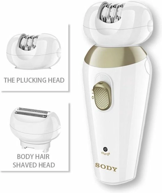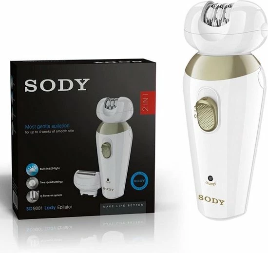 Epileer en scheer in een handomdraai met ??n apparaat. Het SODY epilator en scheerapparaat 2 in 1 geeft na gebruik een gladde huid tot wel 4 weken. Er zitten twee opzetstukken bij, eentje om mee te epileren en een opzetstuk om te scheren. Het scheer- epileerapparaat is snel, je kunt gemakkelijk en veilig haar verwijderen. Je kunt het apparaat instellen op twee verschillende snelheidsstanden. Er zit een LED licht ingebouwd die aangaat wanneer je het scheer en epileer apparaat gebruikt. Hierdoor kun je precies te werk gaan. Wanneer je klaar bent met het gebruik kun je het apparaat schoonmaken met het reinigingsborsteltje en veilig opbergen door het beschermkapje aan de bovenkant te bevestigen. Er wordt een oplaadsnoer meegeleverd. Wanneer het apparaat volledig is opgeladen gaat hij 45 minuten mee. Overige informatie: Silver Pd. alloy motor of high rotational speed.
