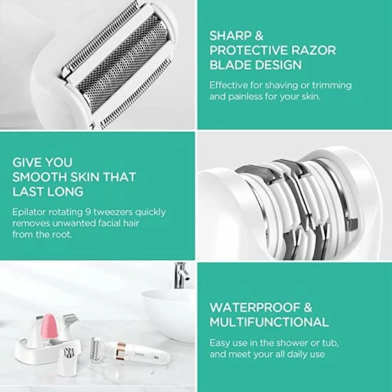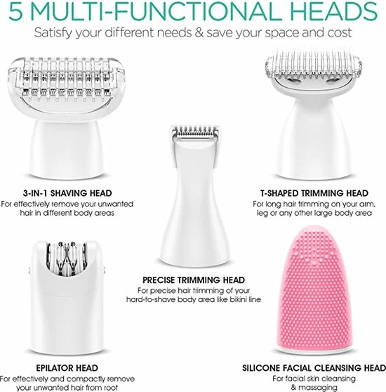 - 5 multifunctionele scheerkoppen: bevat 1 x 3-in-1 scheerkop met lemmetkam, 1 x snijkop met lemmetkam, 1 x epilerkop, 1 x nauwkeurige snijkop met begrenzingskam, 1 x siliconen gezichtsreinigingskop. Maak je look compleet door het hoofd te vervangen en je hoeft niet veel apparaten te kopen.